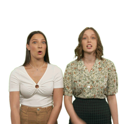 Two women, one with dark hair and one with lighter hair, playfully make a shushing gesture, asking for quiet or secrecy.