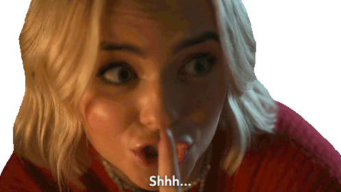 Ruby Sunday from Doctor Who makes a 'shhh' gesture, her finger to her lips, with wide, expressive eyes.