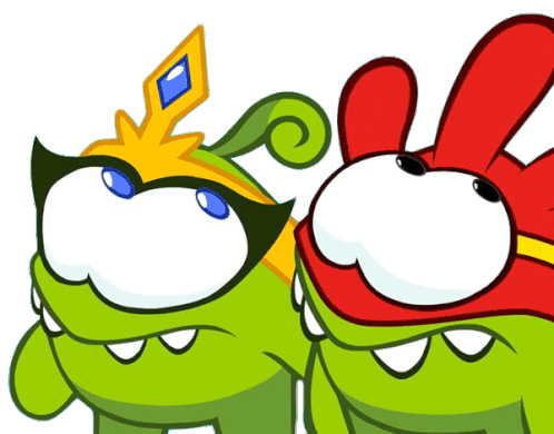 Om Nom and Om Nelle from Cut the Rope look around with shifty, darting eyes, showing a curious or suspicious reaction.