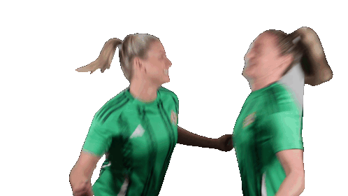Nadene Caldwell and Rebecca McKenna, Northern Ireland football players, celebrate with a joyful shimmy and hug.