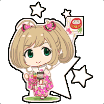 Shin Sato, the Idolmaster character, in a pink floral kimono, holding a kite with stars.