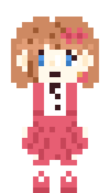 a pixel art of a girl in a pink dress with blue eyes