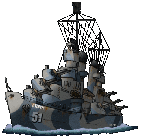 Animated pixel art sticker of the battleship Atlanta 51 firing its cannons with bright muzzle flashes.