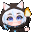 Shiro, a pixel art cat girl with white hair and blue eyes, blinks in her black hooded costume.