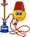 A pixel art sticker featuring a hookah and a yellow face wearing a red fez, connected by a red hose.