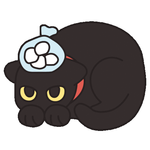 A distressed black cartoon cat lies down, looking sick with an ice pack on its head and tears in its eyes.
