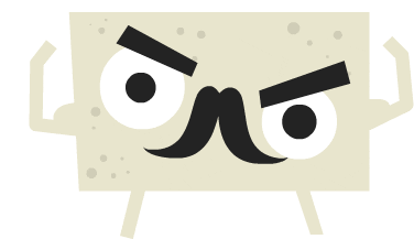 Shk Simple Happy Kitchen character, an angry tofu block with a mustache, flexes its arms in a mad, determined pose.