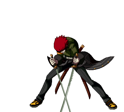 Sho Minazuki from Persona 4 Arena Ultimax, a pixel art fighter, poses dramatically with his two katanas.