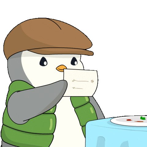 A cartoon penguin looks shocked and surprised after seeing a long, expensive restaurant bill with dollar signs.