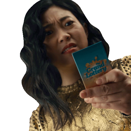 Katie, looking shocked and surprised, holds up a 'Grand Lottery' card, reacting to its contents.