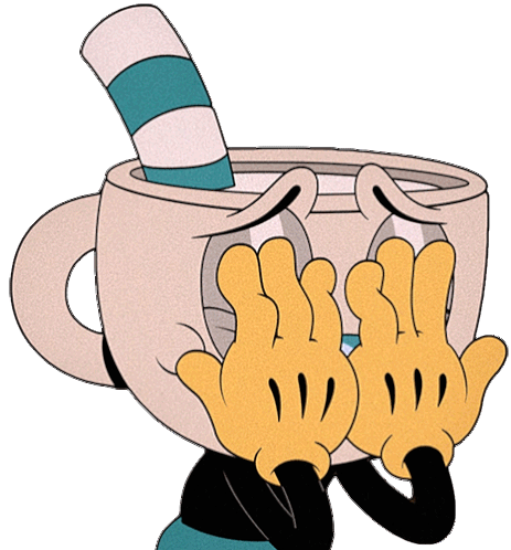 Mugman from The Cuphead Show looks utterly shocked, with wide eyes and hands raised in surprise.