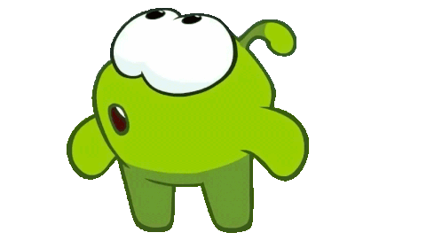 Om Nom, the beloved character from Cut the Rope, is depicted with a wide-eyed, shocked expression, mouth agape.