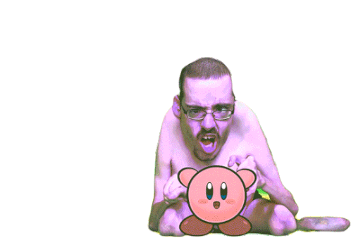 Ricky Berwick reacts with a shocked expression next to Kirby, transitioning from a calm pose to a wide-mouthed scream.