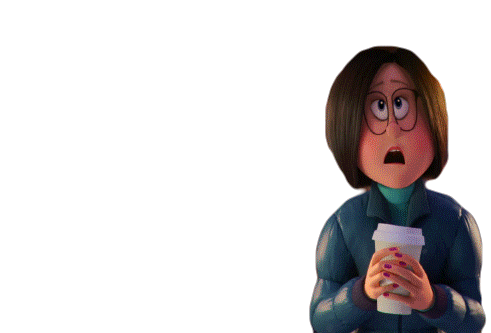 An animated female character from Smallfoot, holding a coffee cup, reacts with a wide-eyed, shocked expression.