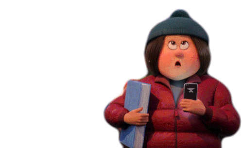 A Smallfoot character, wearing a red jacket and beanie, looks utterly shocked and surprised, holding a book and phone.