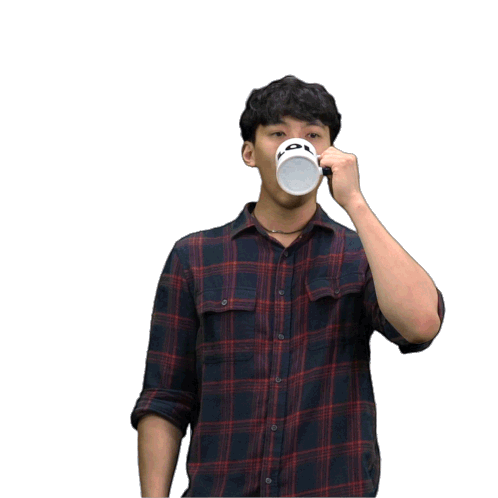 A man in a plaid shirt performs a dramatic, shocked spit take while drinking from a mug labeled 'LOL'.