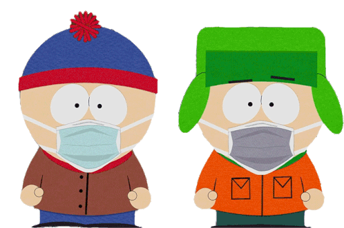 Stan Marsh and Kyle Broflovski from South Park wear face masks, appearing shocked or concerned. A scene from the South Par Q Vaccination Special.