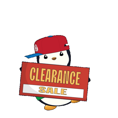 A cute animated penguin wearing a red cap holds up a sign announcing a 'CLEARANCE SALE' with a cheerful wiggle.