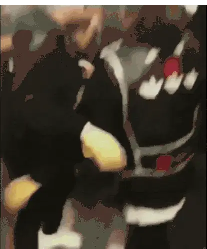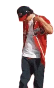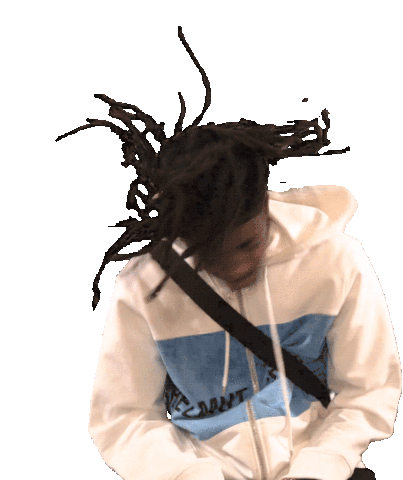 Ohgeesy from Shoreline Mafia energetically headbangs, dreadlocks flying, wearing a white and blue hoodie.
