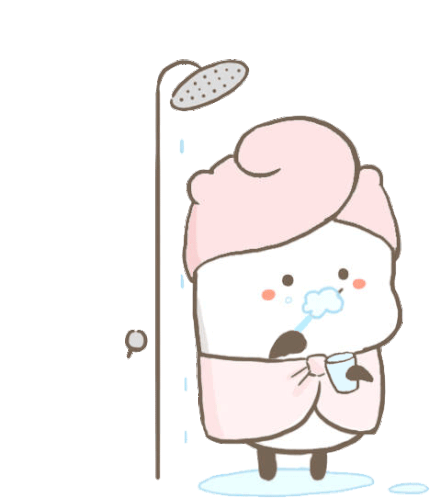 Rumi, a cute character, enjoys a refreshing shower while diligently brushing its teeth, wrapped in a cozy pink towel.