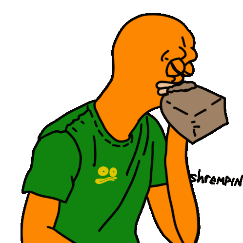 An animated character, 'Shrempin', breathes into a paper bag, depicting anxiety, hyperventilation, and coping with stress.