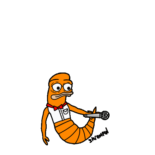 Cartoon orange Shremp character in a bow tie performs a mic drop, ending a performance or statement.
