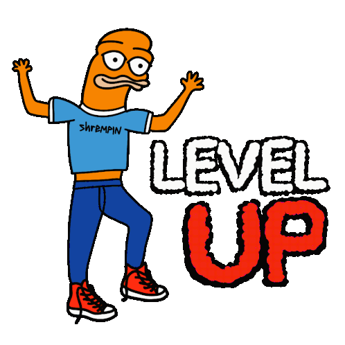 Cartoon character Shremp Shremps celebrates leveling up with arms raised, wearing a 'SHREMPIN' shirt.