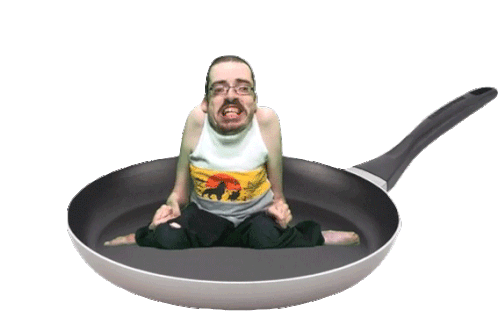 Ricky Berwick is seen sitting in a large frying pan, appearing to shrink and shrivel with an exaggerated expression.