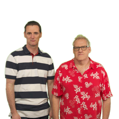 Andrew and Damian from Lego Masters Australia shrug their shoulders, expressing confusion or a lack of knowledge.