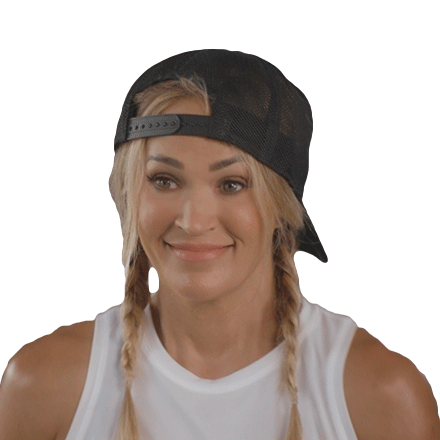 Carrie Underwood shrugging with a playful 'I don't know' expression, wearing a tank top and backward cap.