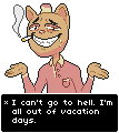 Pixel art Burgerpants from Undertale shrugging, sweating, and smoking a cigarette with a nervous grin.
