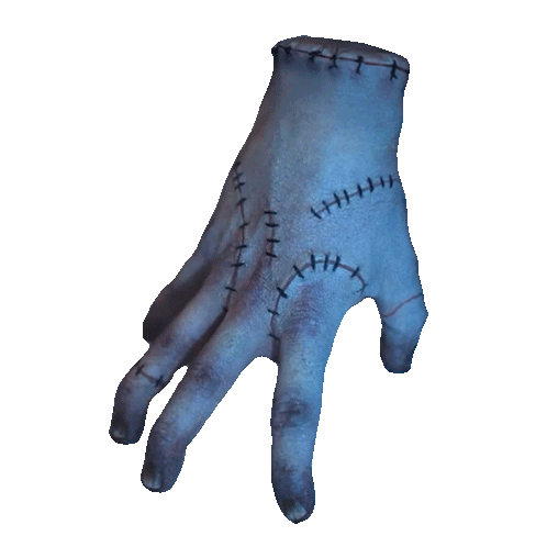 Wednesday Addams' loyal companion, Thing, makes a classic shrugging gesture, expressing uncertainty or 'who knows'.