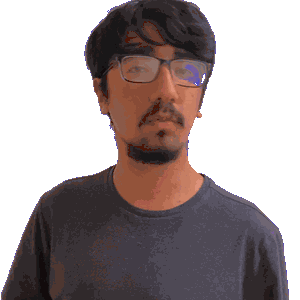 a man with glasses and a beard is wearing a blue shirt