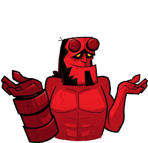 Hellboy shrugs with an indifferent or confused expression, hands raised in a classic 'I don't know' gesture. Perfect for uncertainty.