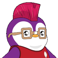 A cute cartoon Pudgy Penguin with a pink mohawk and glasses, making a 'shush' gesture.