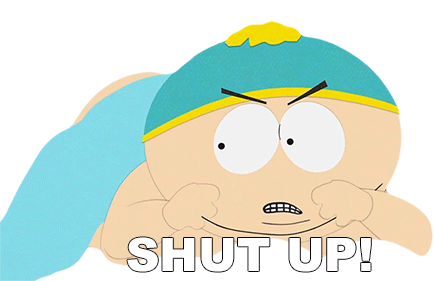 Eric Cartman from South Park with an angry expression, telling someone to "SHUT UP!".
