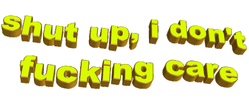 Animated sticker featuring the phrase 'Shut up, I don't fucking care' in bold, yellow 3D text that wiggles and waves.