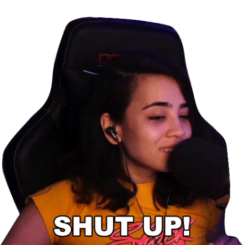 Katcontii, a streamer, emphatically says 'Shut Up!' into her microphone while wearing a yellow top and earphones.