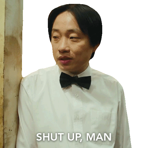 Jimmy O Yang, wearing a bow tie, delivers the iconic line 'Shut Up, Man' from Interior Chinatown.