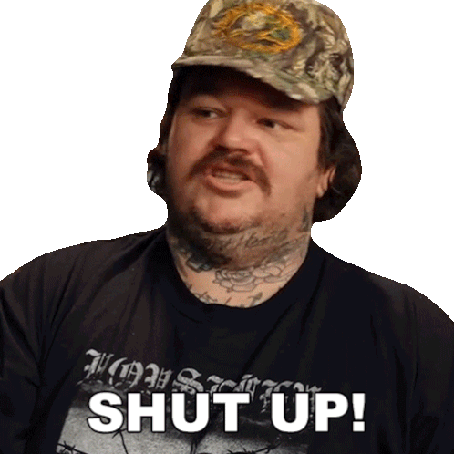 Matty Matheson, wearing a camo hat and black shirt, emphatically says "SHUT UP!" in this funny sticker.