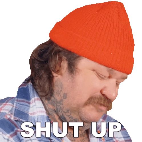 Matty Matheson, wearing an orange beanie, emphatically tells someone to 'Shut Up' with a shushing gesture in this animated sticker.