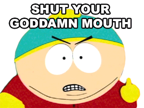 Eric Cartman from South Park angrily tells someone to 'Shut Your Goddamn Mouth' in this animated sticker, perfect for expressing frustration.