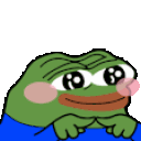 An animated Peepo frog character, blushing with a shy expression, wearing a blue shirt.
