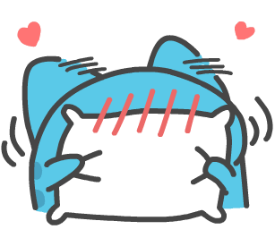 A cute blue cat character holding a white pillow, blushing shyly with hearts appearing around it.