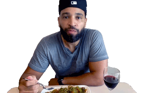 Henry Santos nods 'Si' in approval, enjoying a meal with red wine at a table.