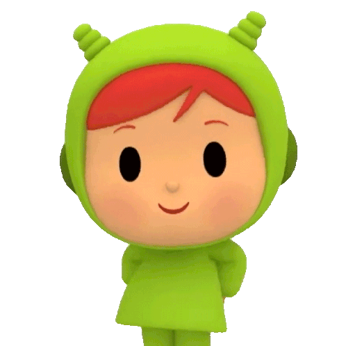 Nina from Pocoyo, wearing a green outfit, smiles sweetly with her eyes closed. She sways gently, expressing happiness.