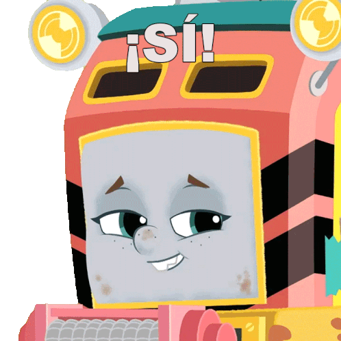 Sandy from Thomas & Friends happily exclaims 'Yes!' with a big smile, showing agreement and positivity.