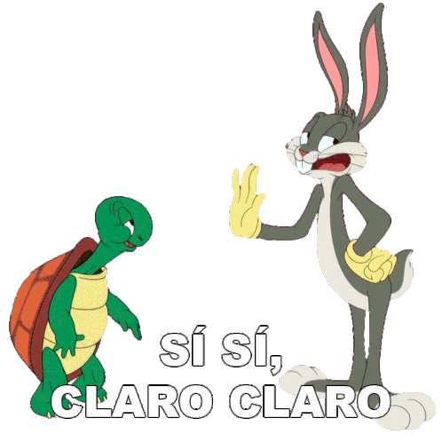 Bugs Bunny and Cecil Turtle in a sarcastic exchange, with Bugs Bunny gesturing dismissively to Cecil. Text reads 'Sí Sí, Claro Claro'.