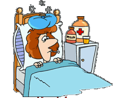 Cartoon woman feeling unwell in bed with a thermometer, ice pack, and medicine nearby, depicting flu symptoms.