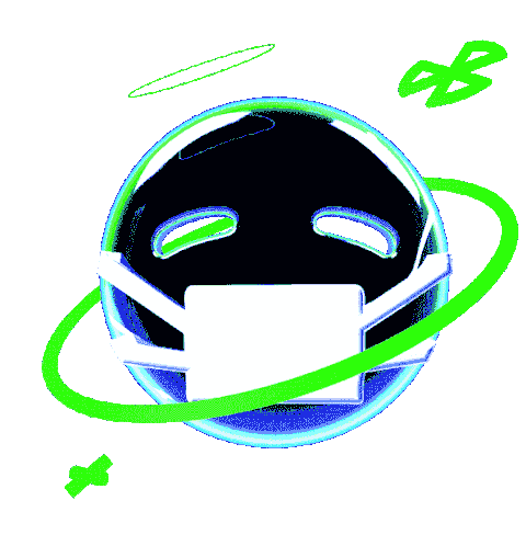 An animated emoji face wearing a surgical mask, surrounded by dynamic green rings and crosses, symbolizing health and safety.